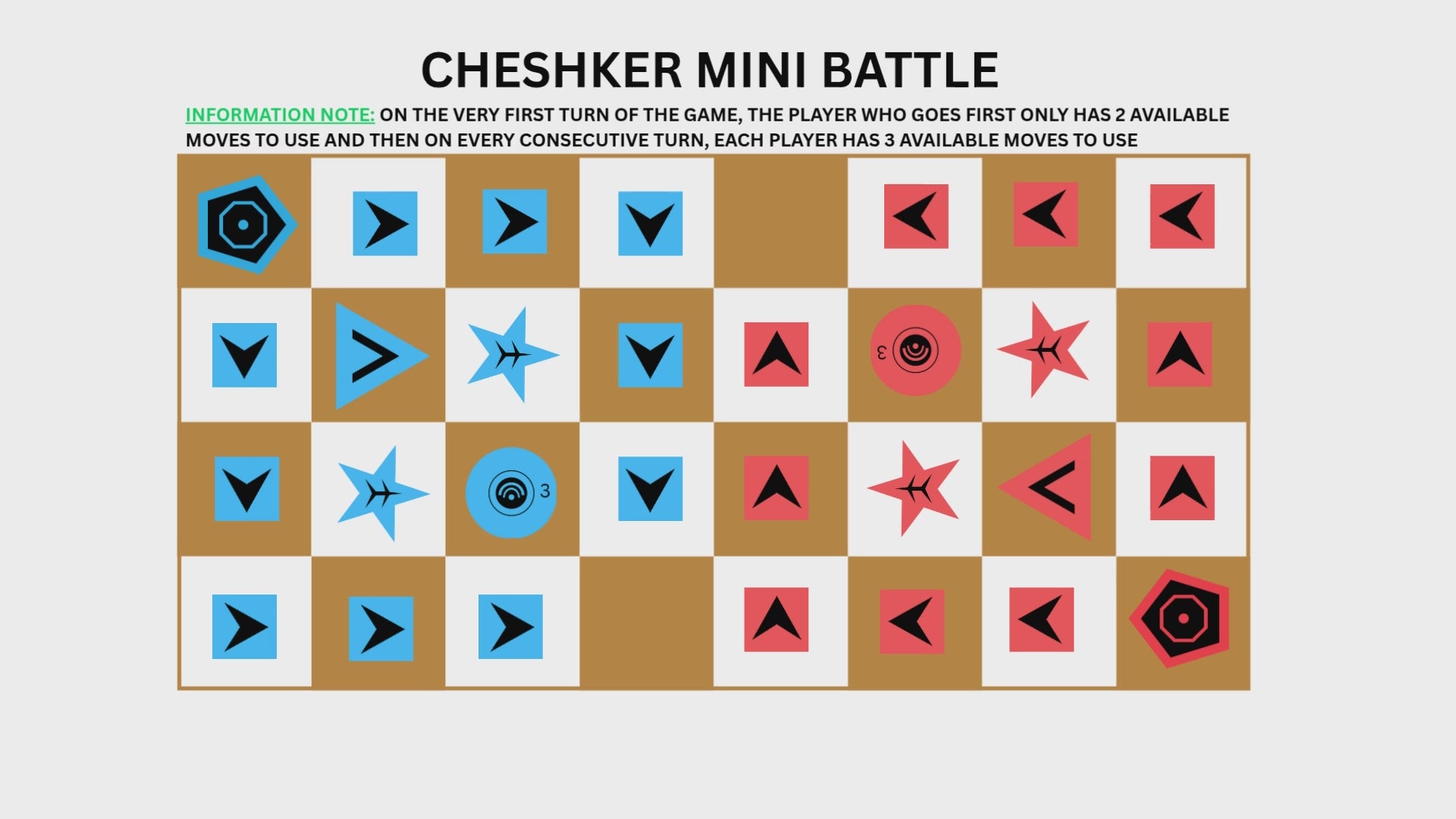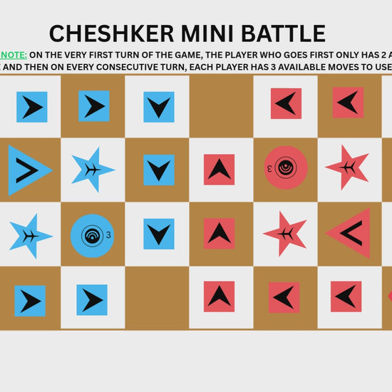 · MINI BATTLE: is the best variant to play for quick short games between 2 players, it is the simplest form of the game and it’s used when teaching beginners for the first time for how each piece moves and the objectives of the game.
